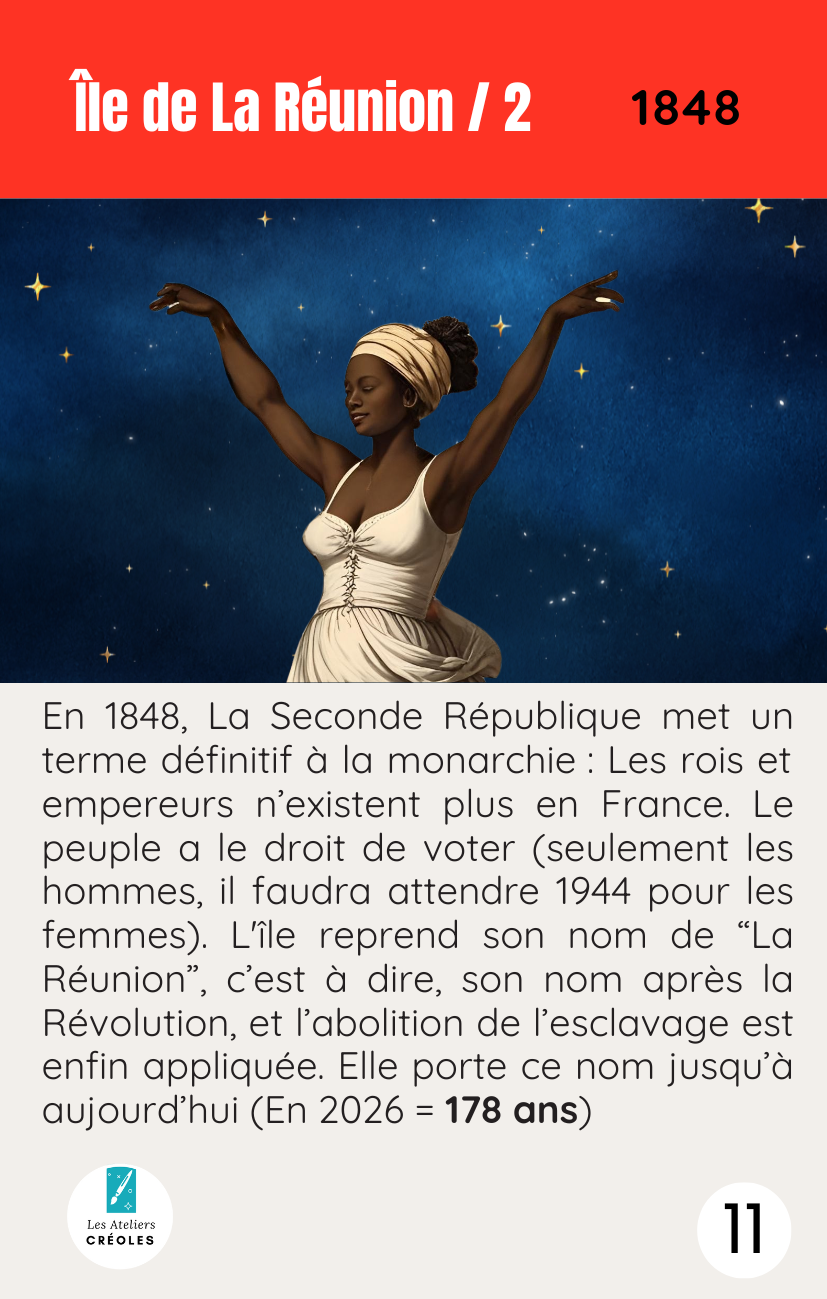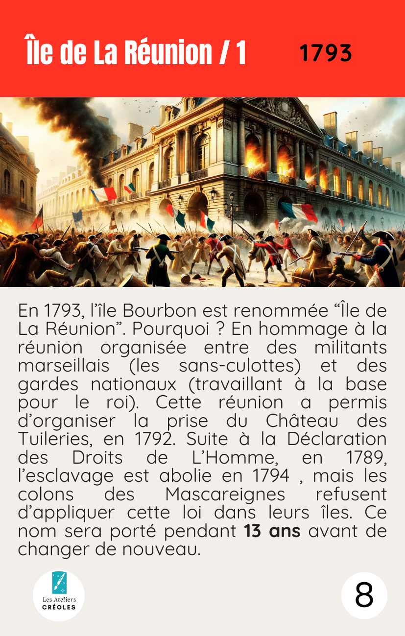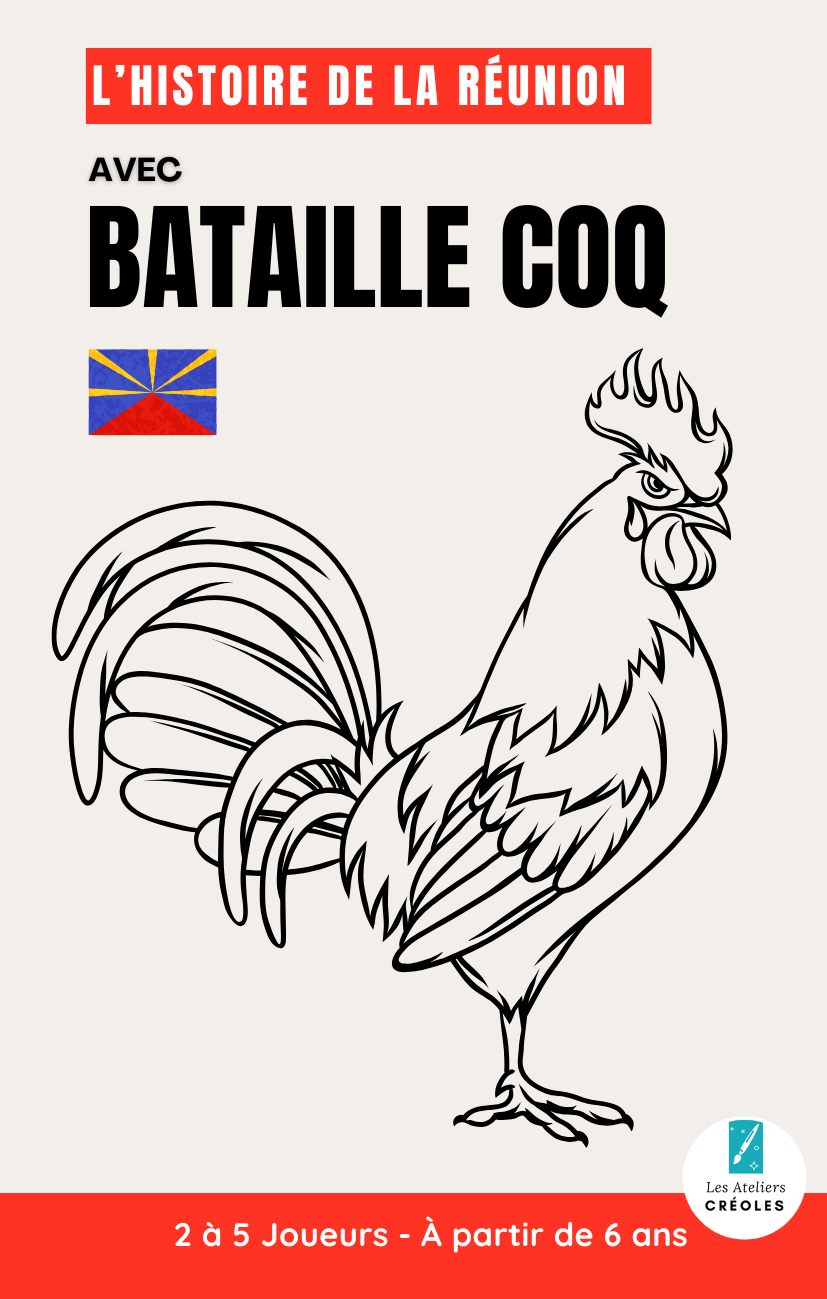 Ce support visuel et tactile accompagne la découverte : chaque carte représente une étape clé de l’histoire réunionnaise. Ce format permet de visualiser les grandes périodes et les repères historiques de façon simple, mémorable et manipulable collectivement. C’est un jeu de hasard, pas de stratégie, donc l’attention est portée sur les différents noms que l’île de La Réunion a porté au fil des siècles.